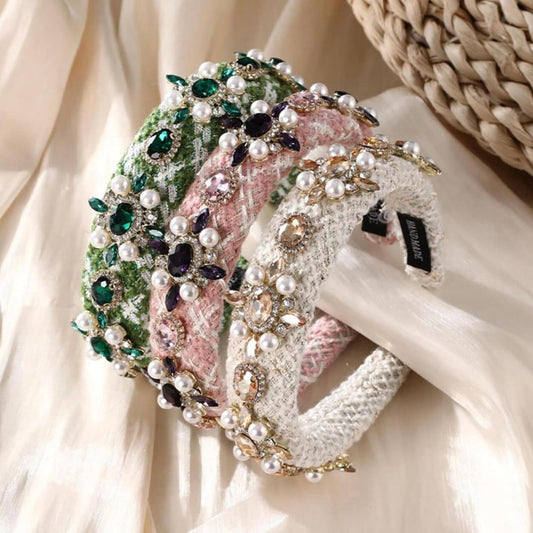Classic Tweed Rhinestone and Pearl head band, elegant, comfy and stylish